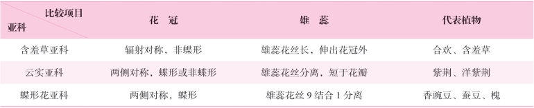 与蔷薇科主要根据雌蕊及果实的差别划分为4 个亚科不同,豆科的3 个亚科在雌蕊和果实上相似性较大,主要是根据花冠和雄蕊的性状来划分的(表5-1)。