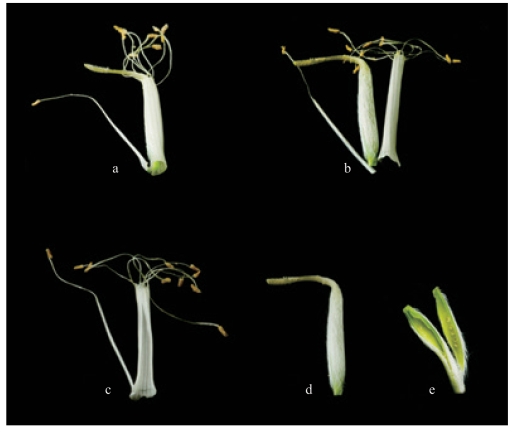 a. 二体雄蕊与雌蕊,右面9 个结合成管,左面1 个分离;b. 分开雌蕊雄蕊,中间折弯的为雌蕊;c. (9) +1 式二体雄蕊;d. 子房、花柱和柱头;e. 子房纵切,可见胚珠