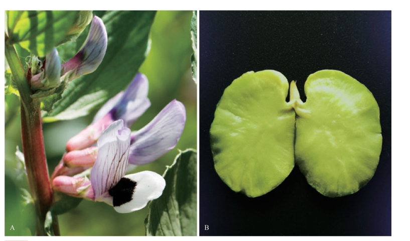 A. 蚕豆的蝶形花冠;B. 蚕豆的2 片子叶(豆瓣)及中间尚未分化的胚芽、胚轴、胚根