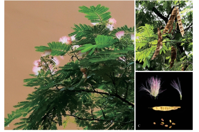 A. 合欢的树冠及其花;B. 荚果;C. 花、果解剖及种子