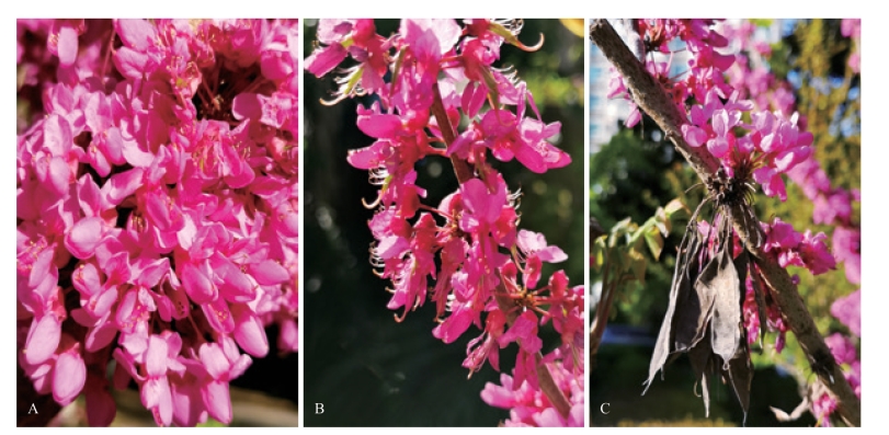 A. 紫荆花盛开;B. 紫荆花谢,子房发育;C. 紫荆当年的花与去年的荚果