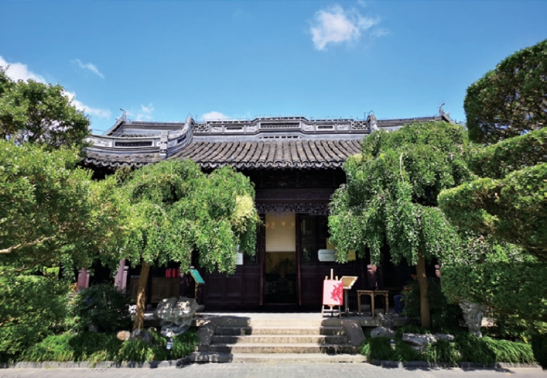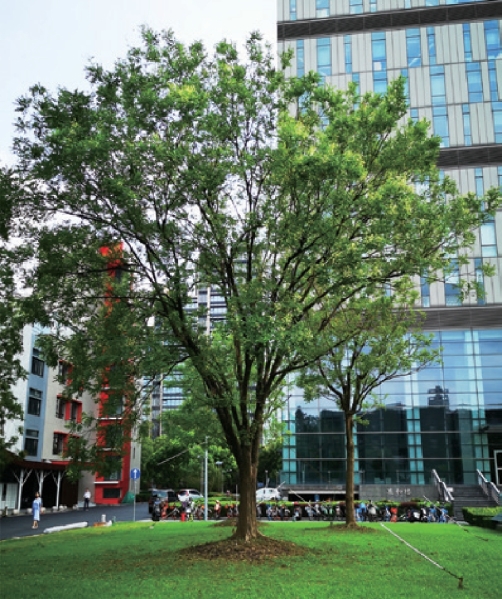 国槐虽然多见于北方,但国槐的一个变型——盘槐(Sophora japonica f. pendula)因其弯曲盘悬、古朴典雅的树形而为江南造园人士所喜爱,上海的古典园林、现代公园绿地和校园都可见到,图5-28 是桂林公园四教厅前的盘槐。