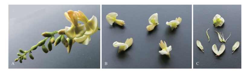 A. 花序;B. 蝶形花冠;C. 花各部分解,花丝分离