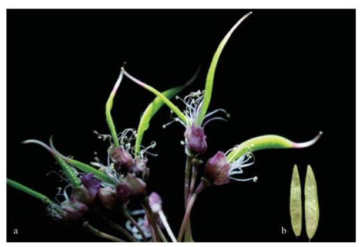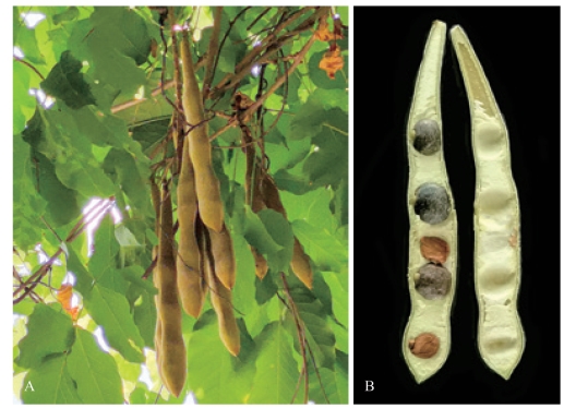 a. 紫荆花谢初果;b. 荚果解剖