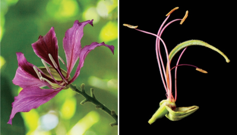 图5-33 洋紫荆的花近观(左)及解剖(右)