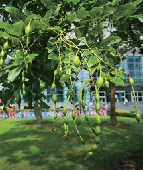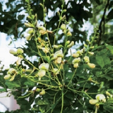 国槐,也称作槐或槐树(Sophora japonica),原产我国,北方多见,上海也有较多栽培,图5-24 是同济大学校园里的槐树。立秋过后,石榴红了,槐花也开放,漫步在校园的草坪上,看到有一地的黄白色的小花。未开花的花蕾称为“槐米”,“槐米”和槐花都有广泛的药用价值。槐花也是蝶形花冠,嫩黄色的旗瓣娇艳迷人,造型凹凸别致,翼瓣好像羽毛非常漂亮,龙骨瓣把花蕊紧紧包裹着。