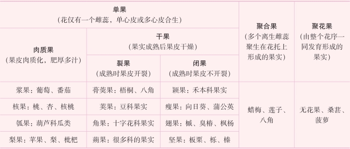 还可以根据花中雌蕊的数目、着生方式及参与果实形成的结构,将果实分为单果、聚合果、聚花果(表5-2)。