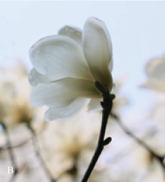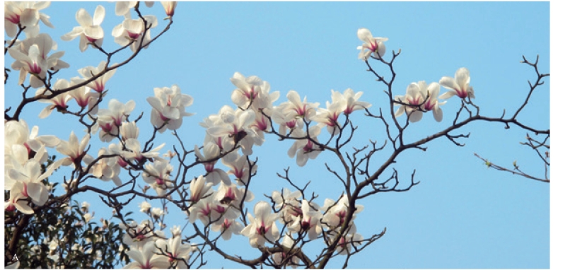 白玉兰花期为3 月,是上海开花比较早的树木。清明节前,乍暖还寒,它就繁花盛开。花时无叶,花大而洁白、芳香,极为醒目。白玉兰花开时朵朵挺立枝头,向上绽放,象征着一种积极向上的精神(图6-1)。