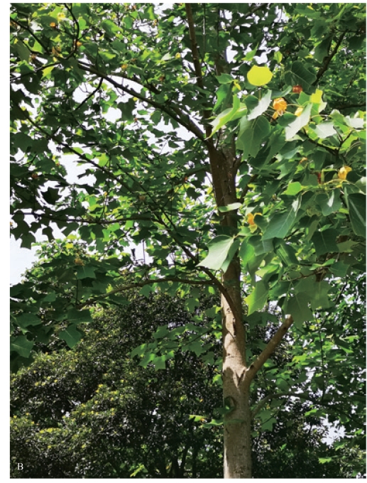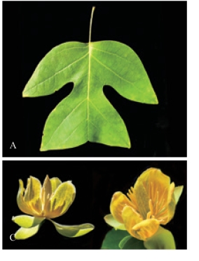 A. 马褂木的叶;B. 马褂木全株;C. 马褂木的花近观