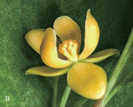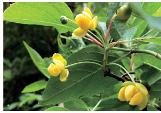 图6-20 是上文提到的华中五味子(Schisandra sphenanthera),这是上海及周边地区分布较多的一种五味子,落叶的木质藤本,叶柄红色,叶缘锯齿明显,花梗细长而使花常下垂,花被黄色。而五味子(Schisandra chinensis)的花多为白色或粉白色,两者容易区分。