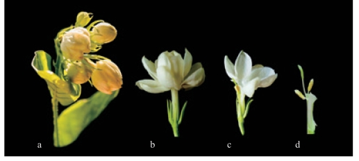 a. 含苞待放;b. 花开放特写;c. 花纵剖;d. 雄蕊2 个,雌蕊1 个