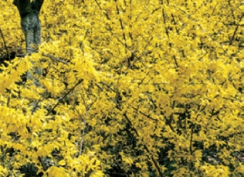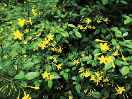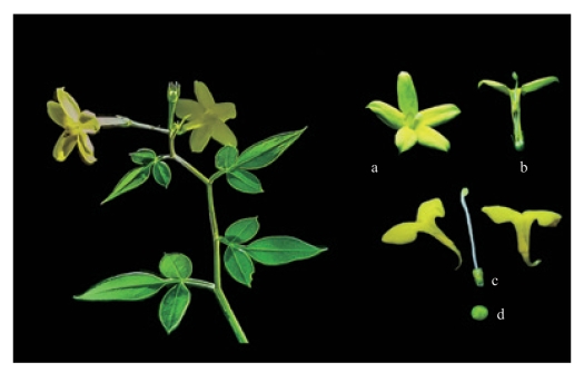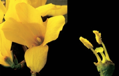 金钟花(Forsythia viridissima)花期3 月,与迎春花花期相近,也是先叶开放的小灌木,花黄色,有时也容易与迎春花相混。图9-21 是金钟花初春开花时的景象,图9-22 是金钟花的花特写及解剖,花冠4 裂可与迎春花区别,雄蕊2 个,雌蕊1 个,亦为木犀科。