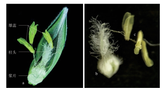 a. 去除外稃后的结构;b. 雌蕊;c. 雄蕊