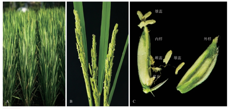 A. 水稻整株;B. 花序近观;C. 水稻的一朵花的构造