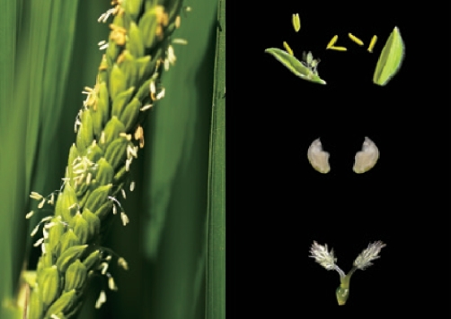 图11-10 水稻花序近观(左)及水稻花的解剖(右)
