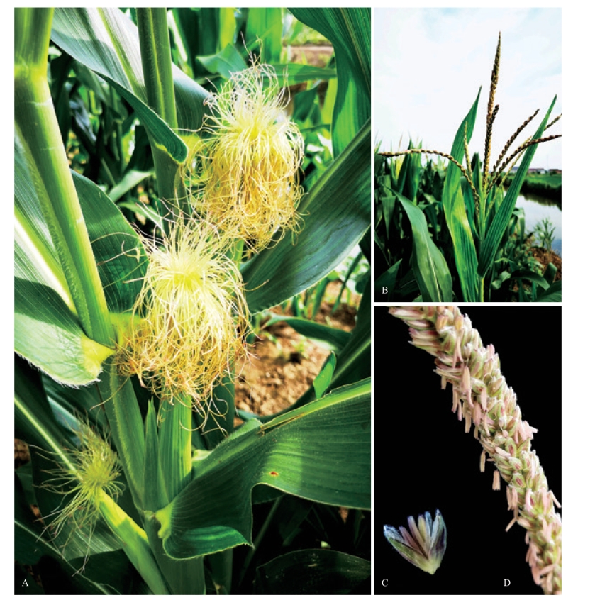 A. 雌花序,生于秆中上部叶腋,细长、蓬松的花柱;B. 雄花序顶生;C. 雄花放大;D. 雄花序近观