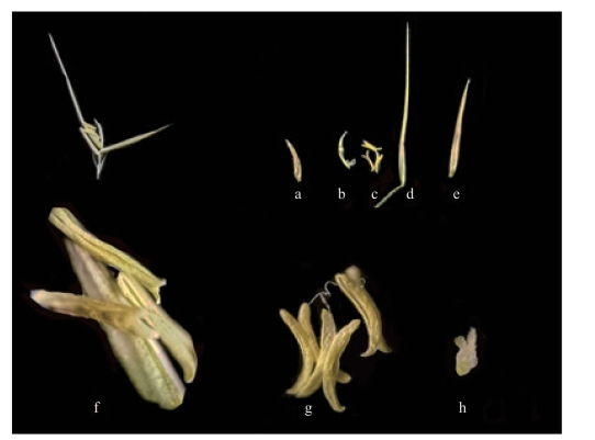 a. 第一颖;b. 内稃;c. 雄蕊3 个,花药黄色;d. 外稃披针形,具芒,长约内稃的2 倍;e. 第二颖;f. 内稃和雄蕊;g. 分离出的3 个雄蕊;h. 雌蕊