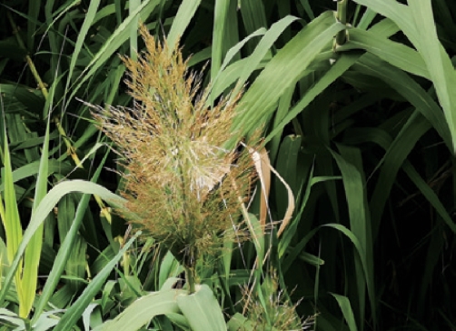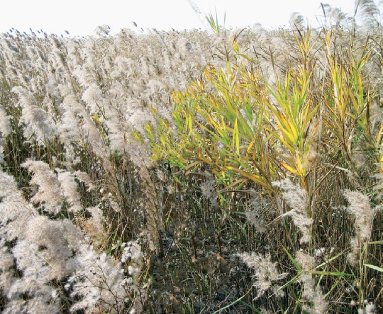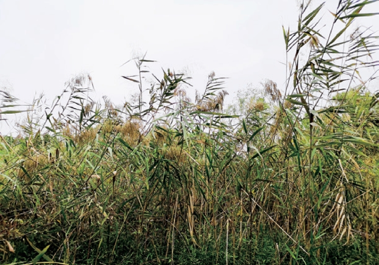 常有人说芦苇和芦竹很像,都株高叶大,不好区分。的确,仅凭植株的高矮来区分两者显然是不够的,当遇到矮小的芦竹或高大的芦苇可能就没有方向了。其实两者的花序在外观上有一个明显的差别——芦竹的花序硬实、挺直,即便如图11-19 中侧向生长,它的花序亦照样与茎秆保持一个方向;而芦苇的花序则比较柔软,易弯斜,而且深秋时分白色的“芦花”极为漂亮,见图11-21、图11-22,芦竹的花(果)序就大为逊色了。