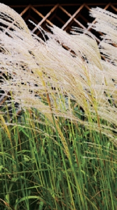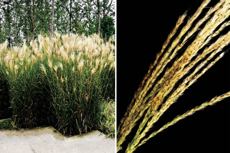 芒草是芒属(Miscanthus)植物的统称,上海及周边地区野外比较多见的是芒(Miscanthus sinensis)和五节芒(Miscanthus floridulus),市区栽培观赏比较多的是芒的一个变种,斑叶芒(Miscanthus sinensis ‘Zebrinus’,图11-25、图11-26),它的叶片上有黄绿相间的斑块,容易辨认。