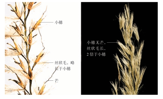 荻(Triarrhena sacchariflora)的花(果)序同样漂亮(图11-27、图11-28)。荻原先也是归在芒属的,后因荻没有芒,丝状柔毛更长、更显著而独立形成荻属(图11-29)。