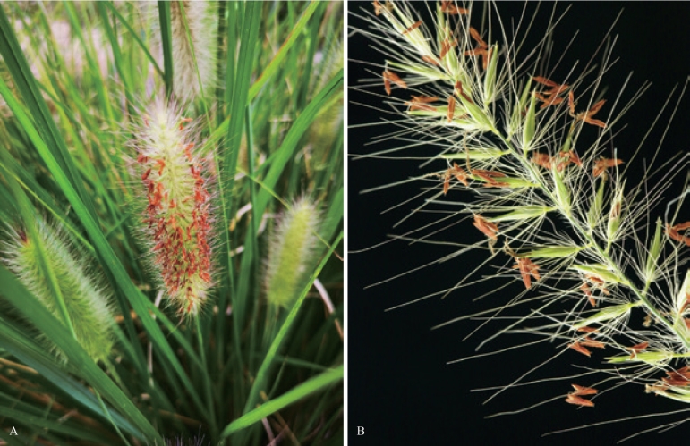 A. 近观;B. 局部放大,刚毛着生在小穗柄顶