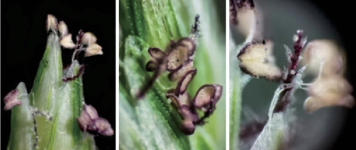 财积草就是一种禾草——禾本科、画眉草亚科、属的牛筋草(Eleusine indica),图11-34 是它的样貌及它的花。叶线形,长约15 厘米,穗状花序数个指状着生于茎顶,解剖镜下它的花药和紫色柱头非常别致和美丽。牛筋草茎叶强韧,全草可入药,也可作为饲料。它的根系非常发达,还是一种优良的水土保持植物。