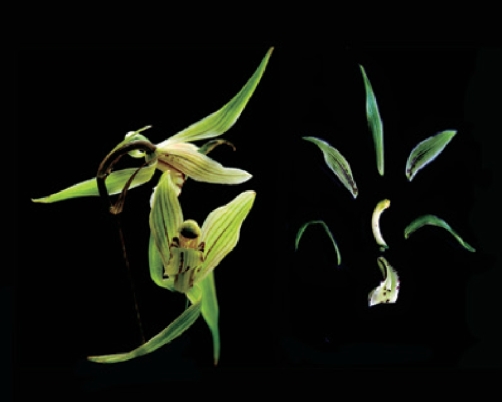 图12-8 寒兰的花近观及花各部的分解(中为合蕊柱,下为唇瓣)