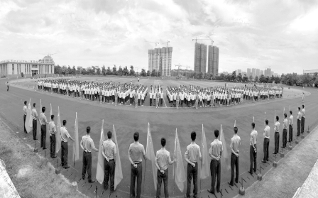 班级安静后,麒麟教官说:“进餐厅前,我们要喊一个响亮的口号,就像部队一样,我喊一遍大家跟着喊一遍。‘军井未掘,将不言渴;军灶未开,将不言饿;雨不批蓑,雪不裹裘;将士冷暖,永记我心。一粥一饭,来之不易,半丝半缕,物力维艰。你我有余,记人保暖,凡我将士,珍物惜源。中华上下五千年,中国人口十几亿,今日你我共餐厅,缘分呀……’”