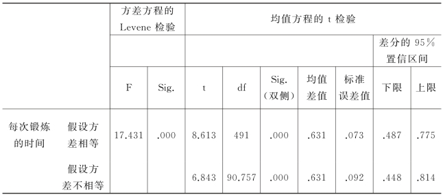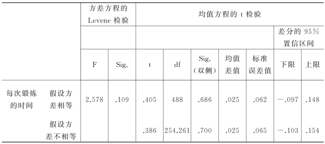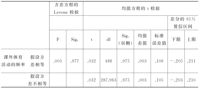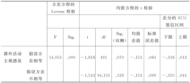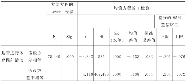 表4-1-21 课外体育活动主观感觉独立样本检验