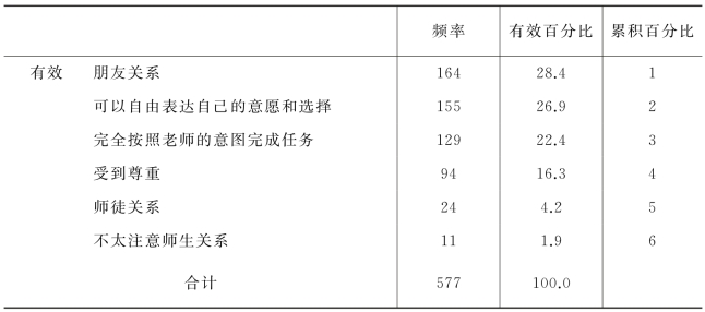 由上表可知,师生关系表达前三位为朋友关系(28.4%),可以自由表达自己的意愿和选择(26.9%),安全按照教师的意图完成任务(22.4%)。排在后三位的是收到尊重(16.3%),师徒关系(4.2%)及不太注意师生关系(1.9%)。由以上数据可知,作为新时代的学生,在当前的以学生为中心的教育教学体系之下,完全不在意师生关系,不关注这一问题的学生是少之又少(1.9%),更多的学生愿意去思考和感受师生的关系(98.1%)。