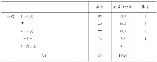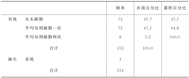 由表4-1-29可知,队员出勤情况整体较好,从未缺勤和平均每周缺勤一次的人数占94.8%。说明运动员的训练参与度较高。学生训练的自觉性较高。
