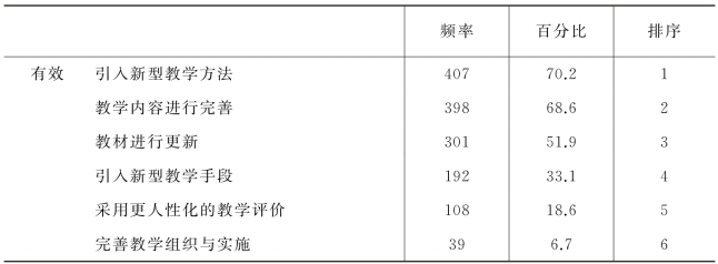 同时需要注意的是在所有选项中采用更人性化的教学评价和完善教学组织与实施两项学生选择的并不多,分别为108人,18.6%和39人,6.7%。说明教师在教学评价和教学组织和实施过程中做得还不是很到位,还需要继续努力。