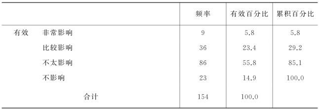 由表4-1-30所示,认为代表队训练不太影响和不影响日常学习的队员比例为55.8%和14.9%,共计70.7%。即7成学生认为代表队训练不会影响日常的学习。只有3成的学生认为代表队训练会影响日常的学习。
