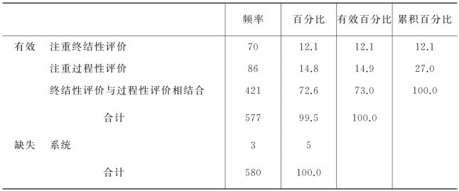 由表4-1-13可知,绝大多数学校都比较注重采用终结性评价与过程性评价相结合的体育课成绩评价方式,在所有调查学校中,有421名学生反映在所在学校采用这种评价方式,占比72.6%;另有14.9%和12.1%的学生反映所在学校更注重过程性评价或是终结性评价来评价体育课成绩。由此可以了解在体育课程教学改革逐渐深化的今天,越来越多的学校采用了比较合理的评价方式,既不一味的看重学生的终结性评价,即期末的考试成绩,也不过于渲染学生的过程性评价,即平时的测试、考勤和课堂的表现,而是采用对于学生学习的全过程进行评价,既有学生在平时的出勤、课堂表现、平时的测试成绩,又有学生在最终检验学生学习效果的期末考试的成绩,这样的体育课成绩评价形式更全面更合理,也更能反映学生的学习效果。