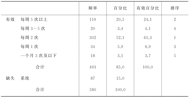由上表可知,课外活动的频率最高的是每周活动两次,占比52.1%,排名第一;而课外活动的频率在五次以上的占比20.5%,排名第二;两项合计共占比72.6%,占总调查人数的七成多。而活动次数每周大于等于3次的占比为28.2%,不足被调查学生的3成,结合已提出体育人口频率判定标准每周身体活动频度3次(含3次)以上这一标准,说明被调查学生的体育活动频率,已达到我国体育人口的标准的人数不多。