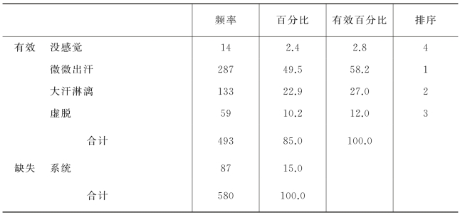表4-1-17为被调查学生课外活动主观感觉分布表,由表可知,有58.2%的被调查学生在锻炼过程中微微出汗,其次是27%的学生反映体育锻炼后大汗淋漓,甚至有12%的学生反映锻炼有接近虚脱的现象,只有2.8%的学生,即14名被调查学生反映课外活动后没有感觉。对照主观感觉的活动强度,微微出汗相当于课外活动已达到中等的强度,说明有接近6成的被调查学生已达到中等强度的锻炼强度,有接近4成的学生达到了大强度的锻炼强度。结合我国体育人口的评判标准中运动强度的标准:?每次身体活动强度中等程度以上。说明由这一数据单纯的可以判定被调查学生绝大多数都已达到中等强度。