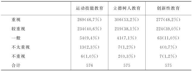 由上表可知,在被调查的学生中,大部分认可教师在体育教育中重视运动技能教育、立德树人教育及创新性教育,分别占比96.7%、98.5%及98.1%,尤以其中立德树人教育占比高,其中重视及较重视比例共计91.3%。这一凸显了现在的体育教师在教学中已经摒弃了传统的体育运动技能的单一教育理念,而是在加强体育锻炼,运动技能的培育过程中,更多的着眼于怎样培养学生的健全人格,培养学生顽强拼搏,艰苦奋斗、不屈不挠的意志品质,做好立德树人的教育。也使得体育教育的由单一的运动技能层面教育变成了多层面的教育形式。