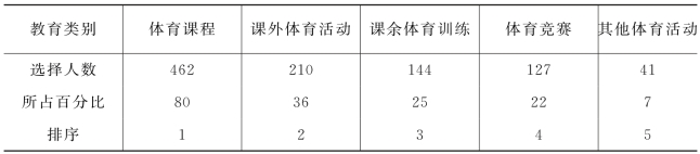 由表4-1-7所示,被调查学生参与体育教育的活动都有分布,五种类型的体育教育活动参与人数由多到少依次是体育课程,课外体育活动,课余体育训练、体育竞赛及其他体育活动,其中80%的学生参与的体育活动是体育课程,这也符合当前背景下,对体育教育的狭义认识,即体育教育等同于课堂的体育教学活动,而课外体育活动、课余体育训练及体育竞赛占比依次是36%、25%及22%。三者相加共计83%,说明在体育教育环节中,除体育课堂的教学活动外,课外体育活动、课余体育训练及体育竞赛参与人数也比较多,是非常重要的体育教育环节。而只是注重体育课堂教学是非常不够的,实际的体育教育工作中,也应该给予除体育课堂教学以外的教育环节足够重视,改善其教育的职能。
