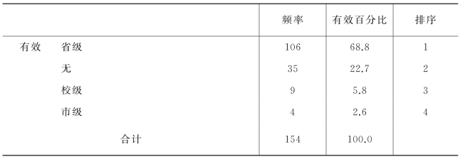 由表4-1-35可知,代表队队员参赛大多集中在1~3次,占比五成。其次是完全没有参赛的队员,再次是参赛次数在7~9次的队员,占比14.3%,排在参赛次数第三位。参赛次数在10次以上的学生最少,占比4.5%。这一数据说明就被调查的这部分代表队队员来说,参赛次数还是比较少的,代表队队员就选拔的目的来讲本身就是竞技的目的,养兵千日,用在一时。然而实际的调查中队员的比赛经验还是不太够,综合之前的队员加入代表队时间进行综合分析,被调查代表队队员中近四成为半年到一年的时间,其次是一年到一年半,占比23.4%(数据见表4-1-36),这样数据似乎合理些,即被调查代表队队员总体入队时间不长,集中在半年至一年半,这个时间阶段。对于入队后的安排,更多的是进行基础的训练计划,而参赛的机会较少。另外目前的参赛级别也说明了比赛的类型还不是很多,队员可增加的比赛锻炼机会不是很多。