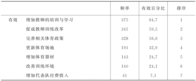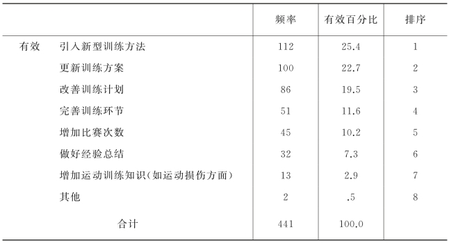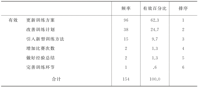 由以上两表可知,更新训练方案是学生们普遍认为可提高训练水平措施,(作为学生的第一选择占第一位62.3%,在学生三个选择中为第二位,占比22.7%。)另外引入新型训练方法、改善训练计划也是学生认为提高训练水平的有效措施,在第一选择和总选择人数排在前三位(其中引入新型训练方法在第一选择中占比9.7%排在第三位,在总选择人数占比25.4%,排在总选择人数的第一位;改善训练计划在第一选择中占比24.7%,排在第一选择人数的第二位,在总选择人数中占比19.5%,排在第三位)。这一结果说明了学生更希望通过更新训练计划,引入新型训练方法及改善训练计划等基础训练的水平的提升上提升自身的运动技能水平,而不是普遍意义上的增加比赛的机会。更好地加强教练员的自身能力培养,增加教练员的技能培训,与更前沿的训练技术的了解,显然是目前教练员首先应进行和掌握的。