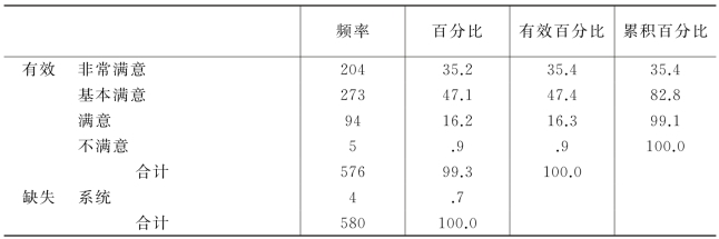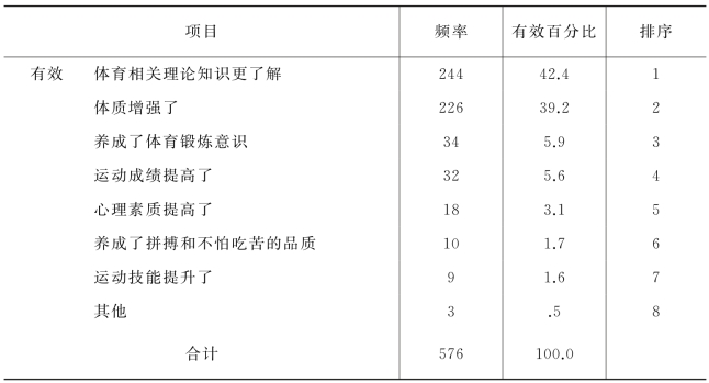 由下表可知,99.1%的被调查学生对当前的体育学习为满意。其中35.4%的学生对自己的收获的满意度为非常满意,47.1%的被调查学生对自己的体育学习收获基本满意。总体来说,学生对当前的体育学习过程还是非常满意的。