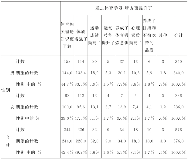表4-1-47 性别*通过体育学习提升能力交叉制表通过体育学习,哪方面提升了