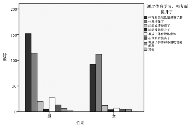 由上图可知,分性别学生的体育教育获得感具有一定的差异性,比较突出的差别在于三个方面,对于男生来说排在前三位的是体育理论知识的提高,体质增强及体育锻炼意识的提升,而比较来说,被调查的女大学生前三位的排序是体质增强,体育理论知识的掌握及运动成绩的提高。显然对于男性大学生来说体育教育给了他们体育知识和体质的同时,更主要的是学生的课余体育锻炼意识提高了;而女生更集中在体育成绩提升,体质的提升上。而对于男女同学的心理素质、运动技能及拼搏及不怕吃苦的精神的获得感都呈现较差的趋势。