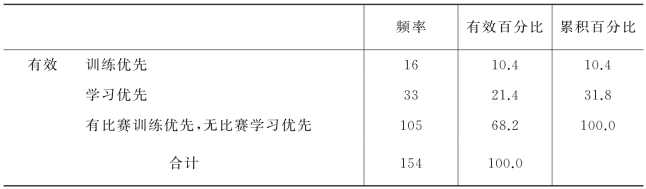 由上表可知,绝大多数学生在处理训练、比赛和学习关系时会选择有比赛训练优先,无比赛学习优先,占比68.2%,其次是学习优先,占比21.4%,再次是训练优先。可以理解为学生的顺序为比赛优于学习优于训练。