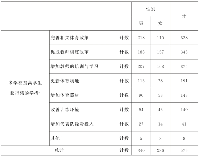 由上表可知,对于提升学生获得感的举措被调查男生与被调查女生认同感不同,其中男生认为学校主要进行了体育政策的完善,其次是教师的培训与学习,而被调查女生则普遍认为学校以增加教师培训与学习及促进教师训练改革为主。