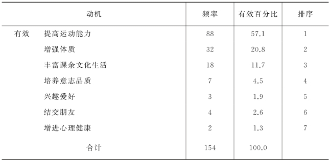 由上表可知,除未作答学生以外,有75%的学生都参加其他的体育活动,只有不到三成的学生未参加其他活动形式。说明学生的体育活动参与形式多样,除常见的体育课程、课余体育锻炼、运动训练及竞赛以外,仍有很多其他形式的活动。