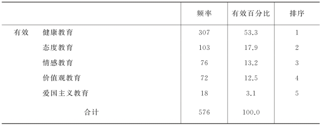习近平总书记在学校思想政治理论课教师座谈会上曾提出新时代贯彻党的教育方针,要落实立德树人的根本任务。当前课程内容的道德教育是必要的。表4-1-42中可以看出态度教育、情感教育、价值观教育在体育教育中所占比例还是提高的。分别占比17.9%、13.2%和12.5%。但也要看出,实际教学中的爱国主义教育并不多见。只占总调查人数的3.1%,如何在之后的体育教育中多些进行爱国主义教育,让学生更多的具有爱国的精神、民族的自豪感,是值得我们深入去研究的课题。