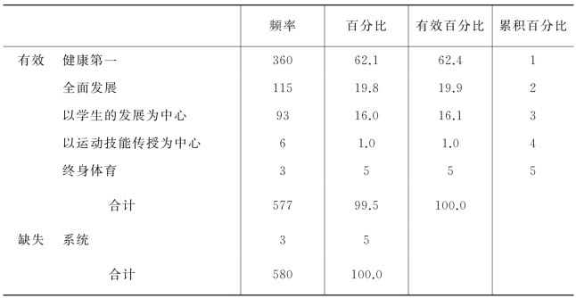③在所有被调查学生中,有6成多的学生认为教师在教学过程中体现的教学理念为健康第一,占比62.1%;其次是全面发展,占比19.9%;再次是以学生的发展为中心,占比16.1%。而认为教师在教学过程中以终身体育为教学理念占比只有0.5%。学生并未在教学过程中体会到教师教学是以学生终身体育习惯的养成为教学目的的,对于学生体育习惯的养成,良好的体育生活方式的具备非常不利,不具备健康体魄的延续性,不具备体育所带来的对个人成长,身体和心理健康的促进性作用,不具备可持续性。