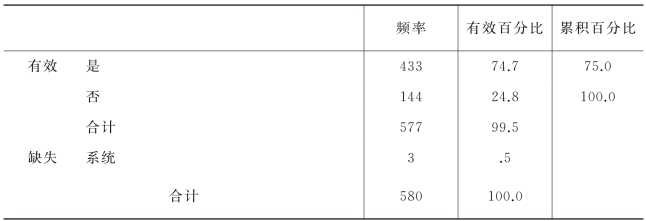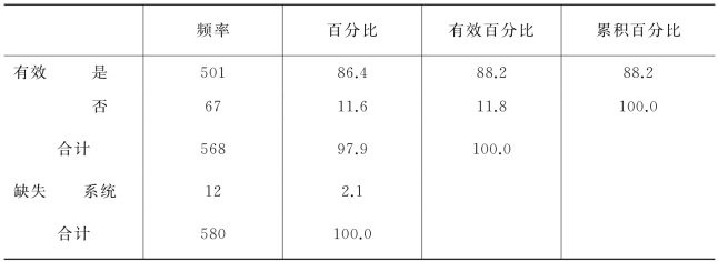 有上表可知,在问卷中已有三自主的解释说明的情况下,仍有极少一部分未填写该题,其中一种极大的可能就是学生对本学校体育课程是否为三自主情况不明确,不了解,抑或是虽然开设了三自主的体育选课机制,但执行不到位,未发挥实际的功能。除此之外,绝大多数学生(501人,86.4%)选择了学校内已开设三自主的体育课堂教学,意即本校的体育课程做到了学生在参与体育课堂教学中可以自主选择项目,自主选择时间和(或)自主选择授课教师。说明对于河北省的高校来说,绝大多数学校已经实行了体育课堂的三自主选课模式,使得学生在接受体育课程教学之前,已经可以通过自由意志选择自己喜欢的体育项目、自由选择上课时间和(或)自己喜欢的授课教师。这样的一个选课流程,考虑到了学生的自主选择权,以人为本的理念,是后期学生学习后的获得感的实现非常必要的基础。