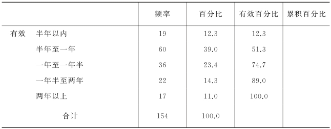 由上表所示,在被调查的154名代表队队员中,队员加入代表队的时间不等,以加入代表队半年至一年时间的为多,约占被调查代表队队员的39%,而入队两年以上及半年以内的队员较少。